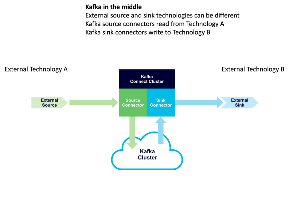 Here’s a reminder of how Kafka Connect works with heterogeneous source and sink technologies: