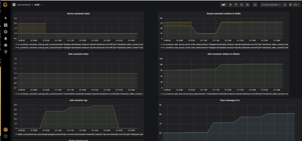 Having the end-to-end Prometheus pipeline metrics in a single Grafana dashboard made it very easy to see what was going on in terms of throughput and lag, all the way from the source connector input rate, the topic rate, the sink connector rate, and the Elasticsearch index rate, aided by the sink connector consumer group lag.
