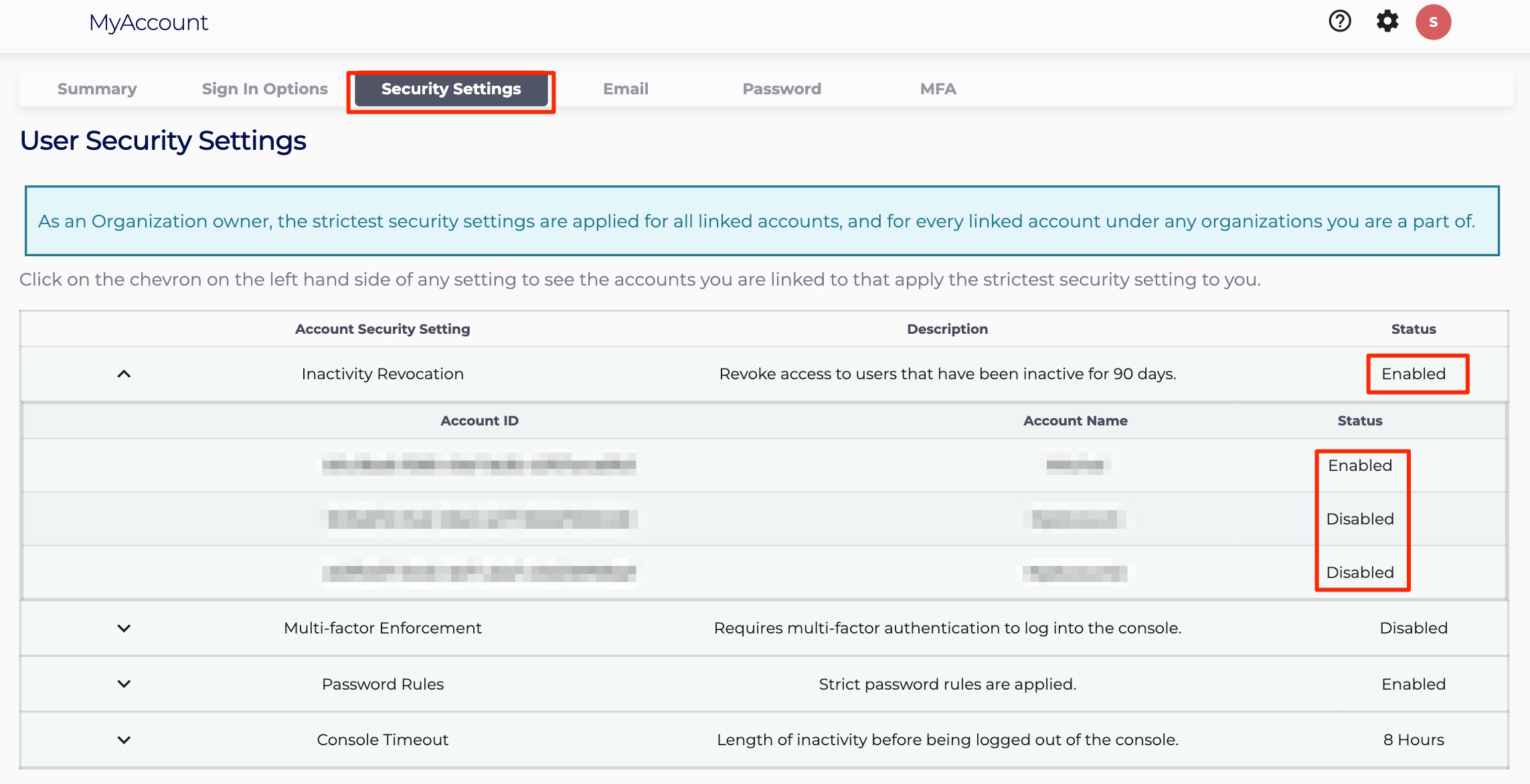 From here a list of all security settings are available. Each setting includes a short description as well as a status – if the setting is enabled or disabled, or if the console inactivity timeout is either 15 minutes or 8 hours. By clicking the chevron to the left of each row, a list of all linked accounts is shown, with their specific setting status. You are subjected to the strictest security setting set on each account.
