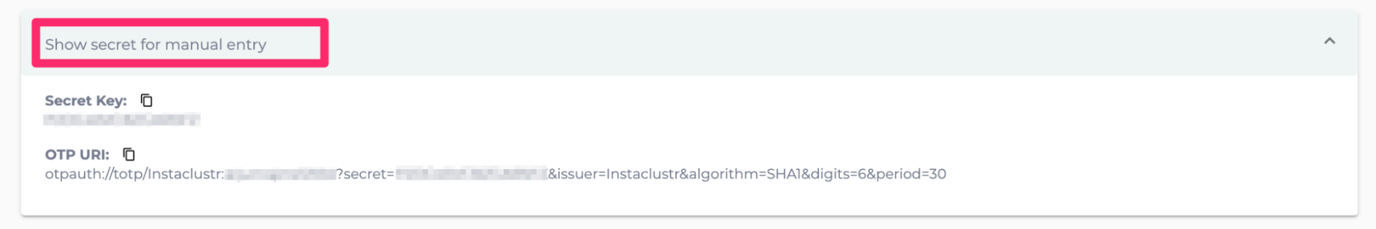 - If your TOTP application is unable to scan QR codes, you may alternatively expand the Show secret for manual entry section to manually register the Secret Key and the OTP URI.