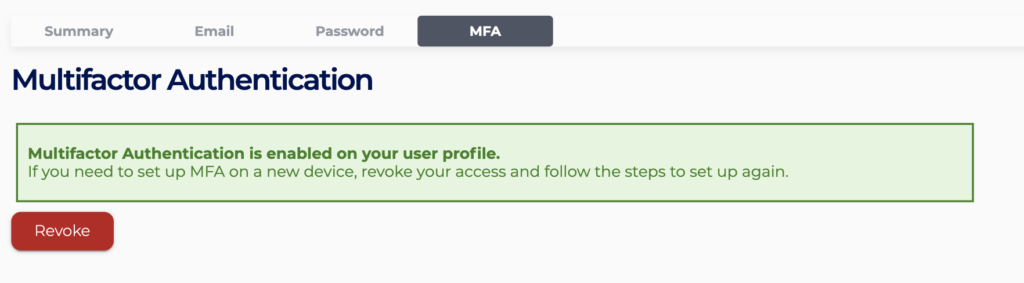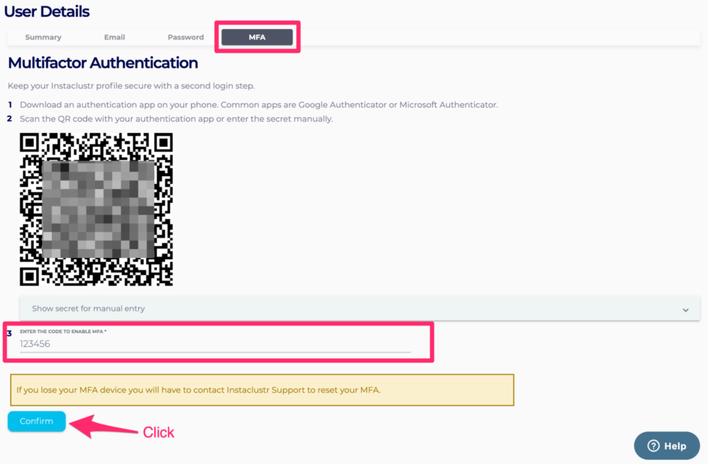 - Navigate to the MFA tab, scan the QR code with your favourite TOTP app, enter the generated code and click on the Confirm button to verify your code