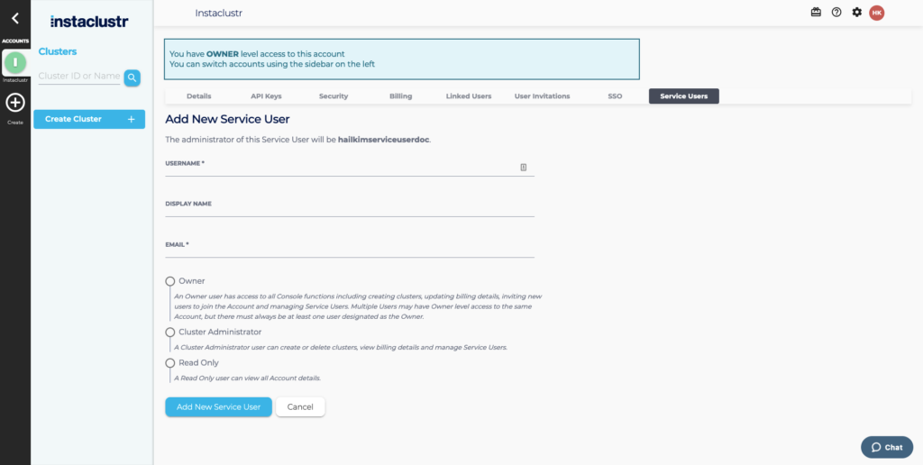 Owner and Cluster Admin level users in an account can create Service Users. The user who creates a Service User automatically becomes an Administrator of that user. Administrators of a Service User may invite additional Cluster Admin users to be Administrators of that user. Owner users in an account automatically have Administrator-level access to all Service Users in that account.