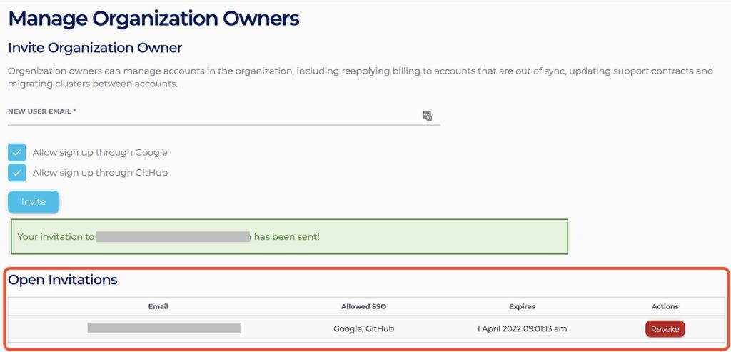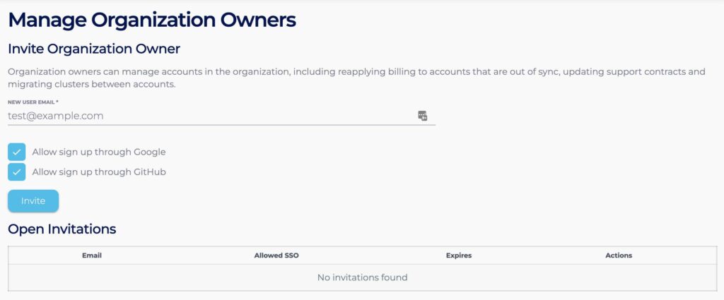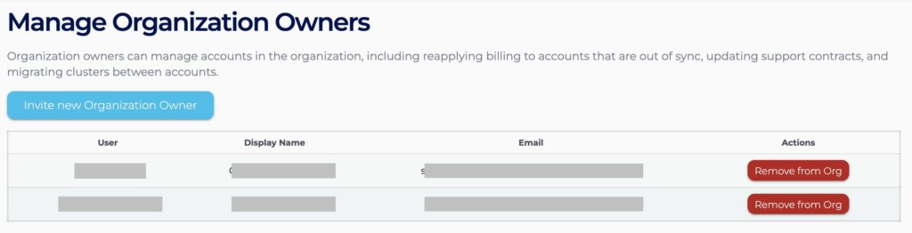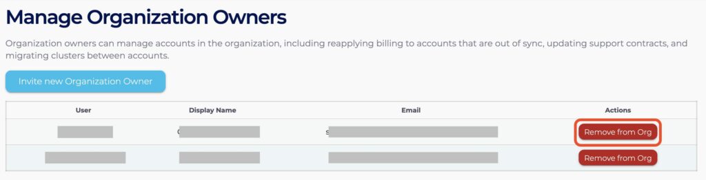 Note: Removing an Organization Owner only prevents the user from managing the organisation. It doesn’t prevent the user accessing Accounts and clusters they are a member of. The user should be removed from those accounts under the Account Settings page on Console.