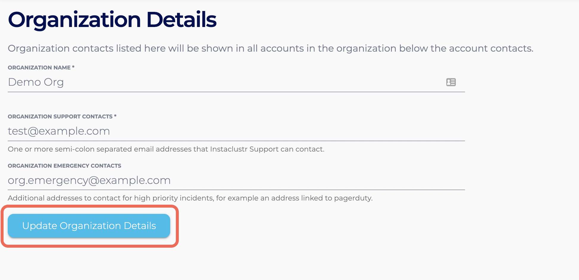 The Organization Details page enables you to be able to manage a number of details about the Organization, such as the Organization Name, Organization Level Support Contacts and Organization Emergency contact details. You also have the option of synchronizing the contact details of the linked accounts to be the same as the contact details of the organization. These details will be visible to all users on an account, as well as our technical support team.