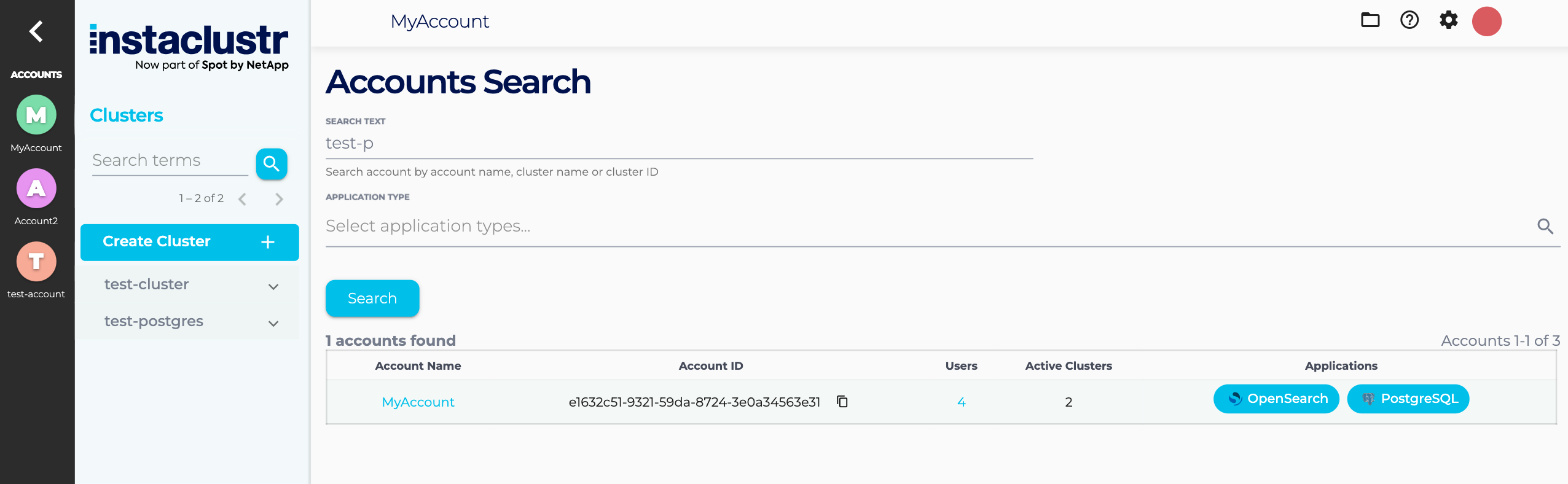 Note: Selecting an application type and leaving the search text field empty will list all accounts related to the chosen application type. If you are searching for an account with a cluster name, and if multiple clusters exist with the same name in one or more accounts, then the search result will display all the accounts with clusters with the same name.