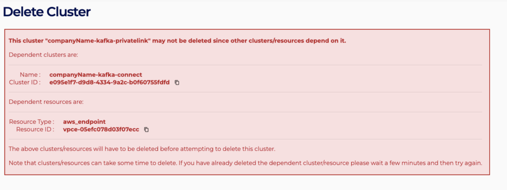 - If the cluster has a dependent cluster or other resources like AWS endpoints, the Delete Cluster page would show the dependencies you must delete before deleting the cluster.