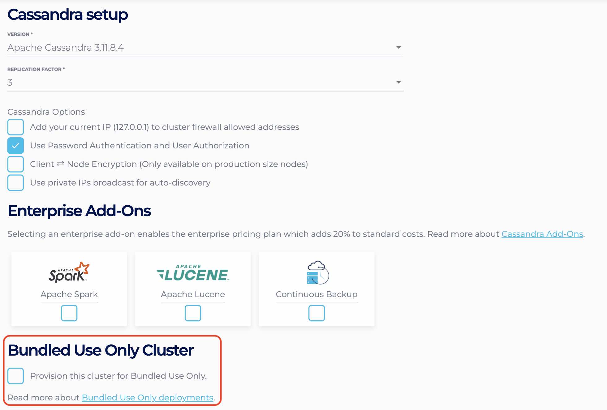 If you would like to provision a cluster as a Bundled Use Only deployment, you simply need to select the appropriate checkbox that will be displayed in the ‘Options’ stage of our console cluster creation wizard, for any of our relevant offerings.