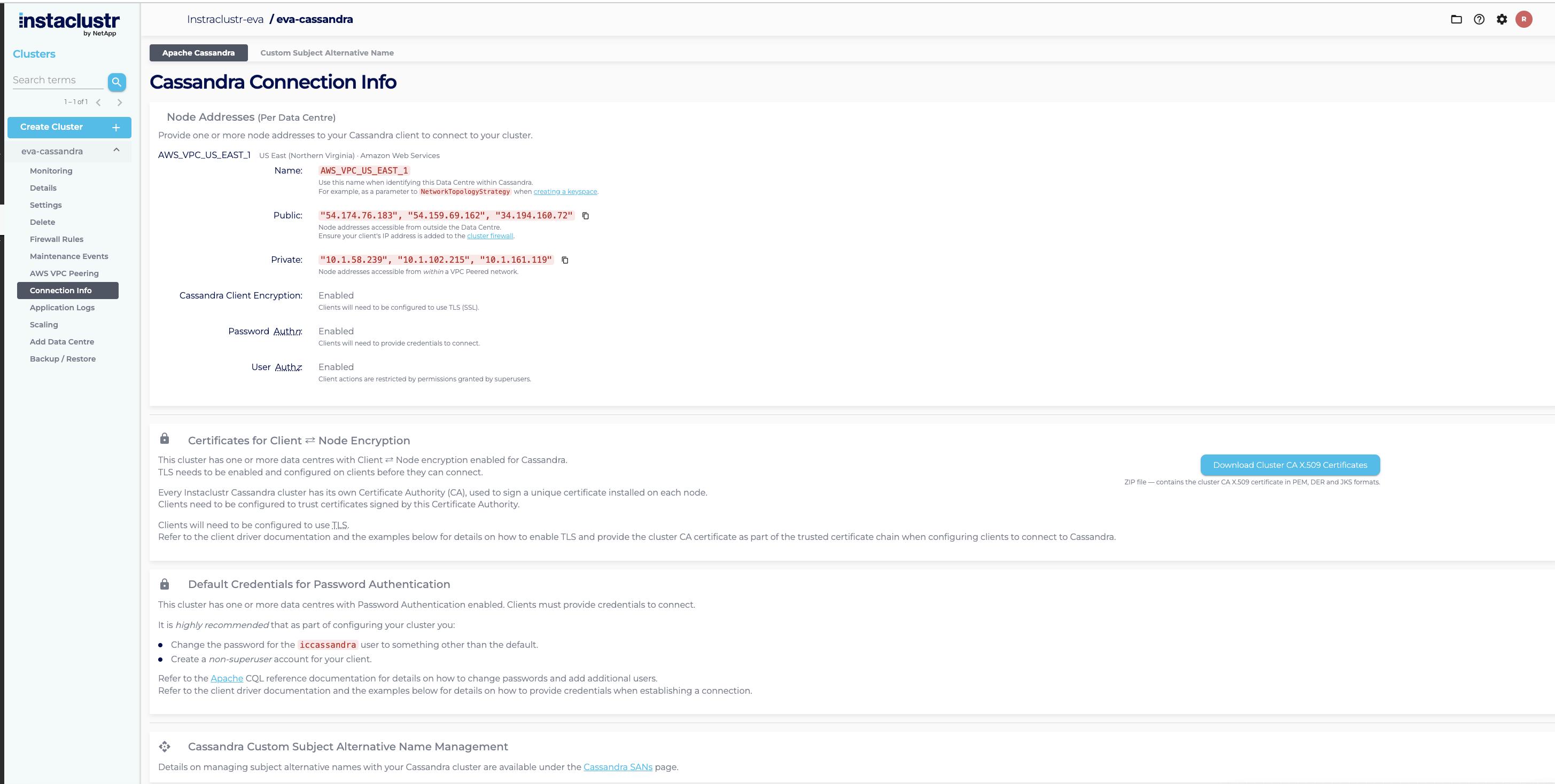 - The Connection Info page contains a list of your node addresses, authentication credentials to connect to your cluster and a few connection examples for popular clients Cassandra supports.