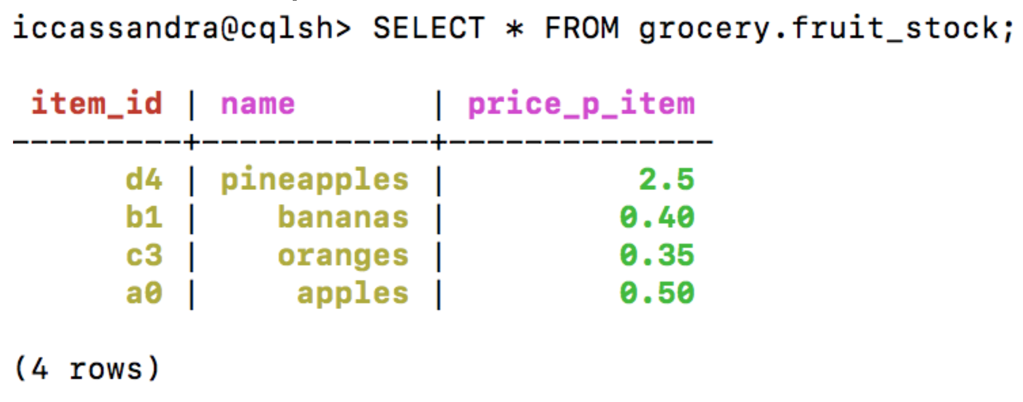 CREATE KEYSPACE grocery WITH REPLICATION = {'class' : 'SimpleStrategy','replication_factor' : 1}; CREATE TABLE IF NOT EXISTS grocery.fruit_stock (item_id TEXT, name TEXT, price_p_item DECIMAL, PRIMARY KEY (item_id)); INSERT INTO grocery.fruit_stock (item_id, name, price_p_item) VALUES ('a0','apples',0.50); INSERT INTO grocery.fruit_stock (item_id, name, price_p_item) VALUES ('b1','bananas',0.40); INSERT INTO grocery.fruit_stock (item_id, name, price_p_item) VALUES ('c3','oranges',0.35); INSERT INTO grocery.fruit_stock (item_id, name, price_p_item) VALUES ('d4','pineapples',2.5); |