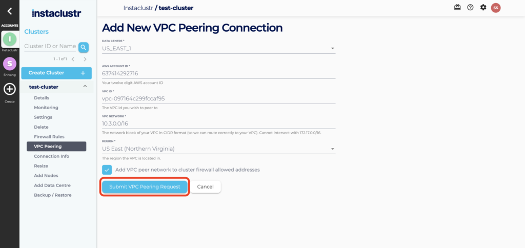 - Fill in the required information on the VPC Peering Connections and click the Submit VPC Peering Request button.