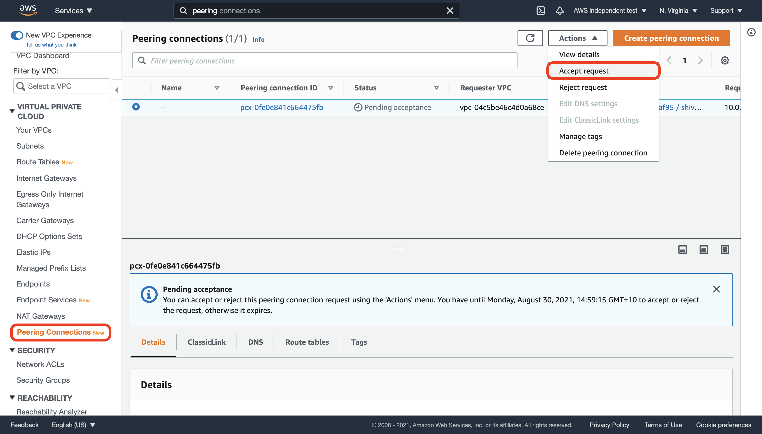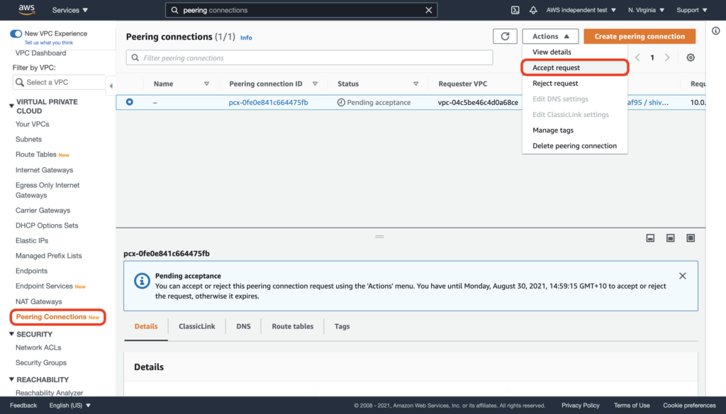 - In order to accept the request, you will need to login to your AWS console to accept the peering request and add a route in your VPC to our VPC.In order to accept the peering request, login to the AWS VPC console and navigate to Peering Connections. Select the pending VPC peering connection and choose Actions, Accept Request.