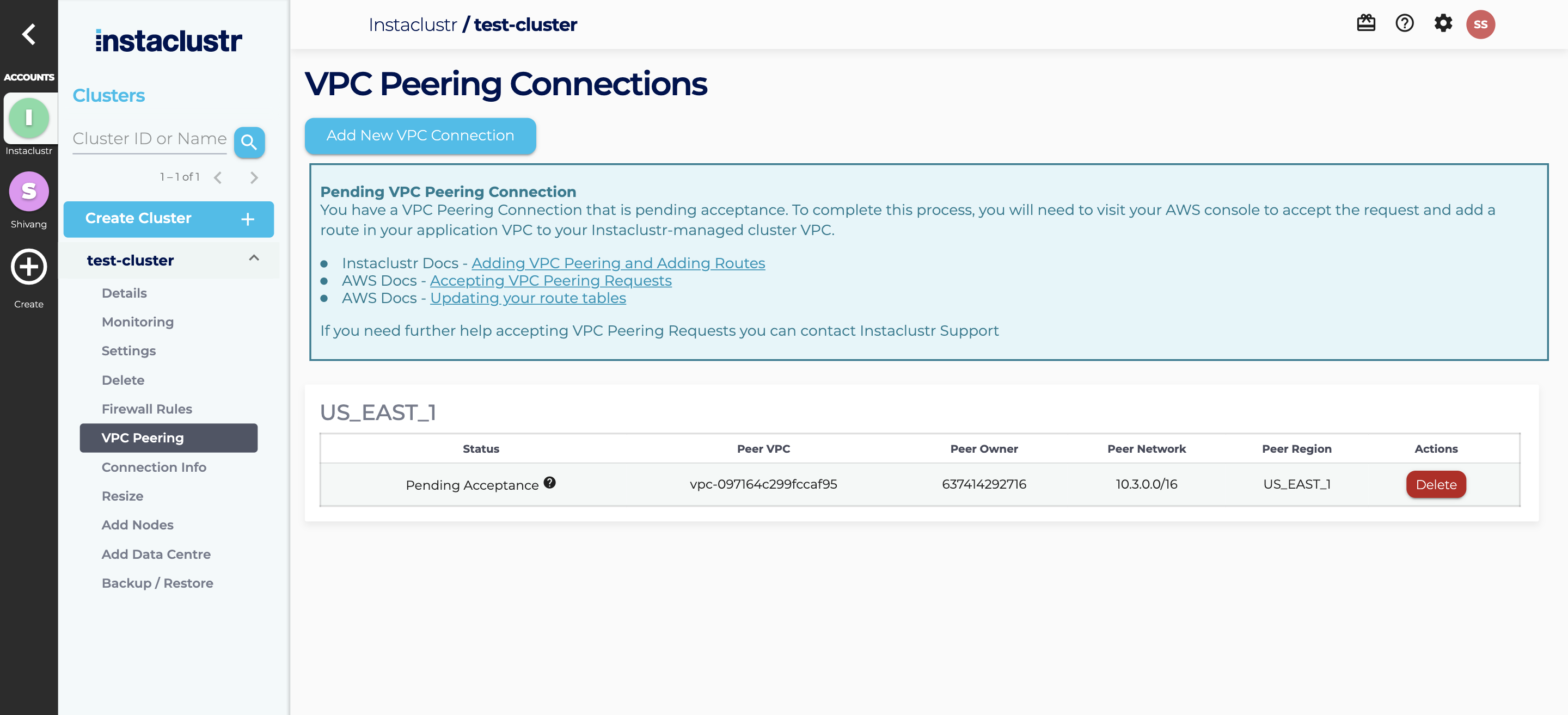 VPC Peering is a method for routing traffic between two VPC’s privately. For an overview on VPC Peering see the AWS VPC Peering Guide. Instaclustr supports VPC peering as a mechanism for connecting directly to your Instaclustr managed cluster, from your own client VPC. VPC Peering allows you to access your cluster via private IP and makes for a much more secure network setup.
