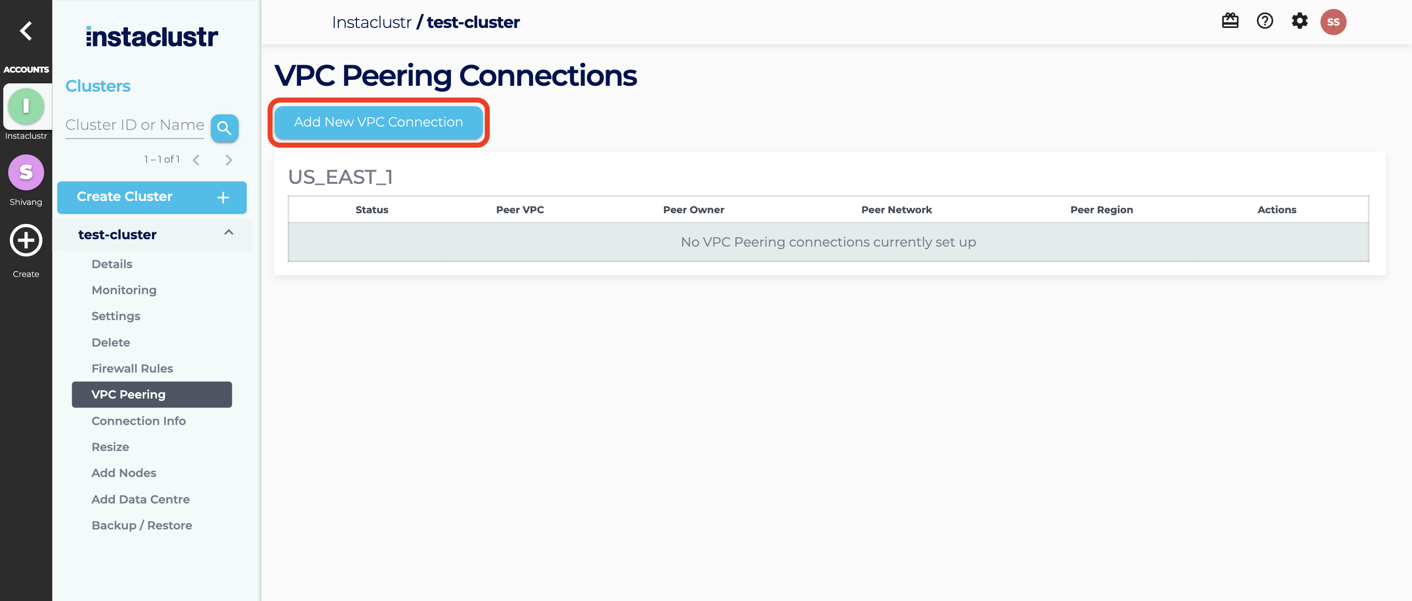 - Once your cluster has been provisioned, you can create a VPC Peering request through the Instaclustr console. Navigate to the VPC Peering tab of your cluster and then click on Add a New VPC Connection.