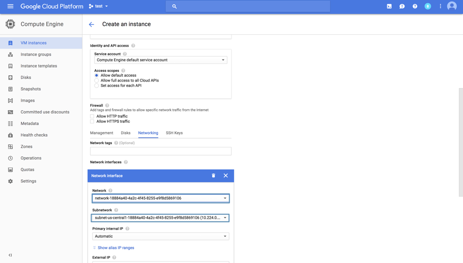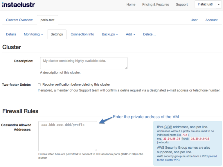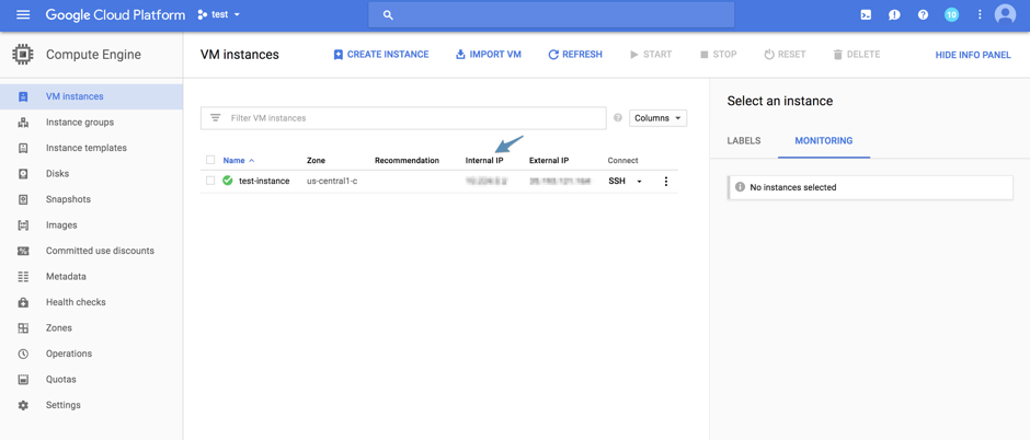 2. After you have created the virtual machine, you have to add a firewall rule to Cassandra to trust connections from the Internal IP of the VM. The Internal IP can be found on the VM instances page.