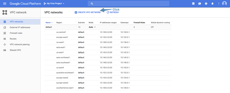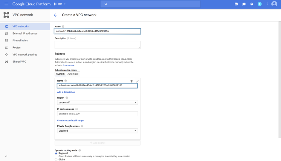 The Network will have the following nomenclature: network-<cdcID> and the Subnetwork will have the following nomenclature: subnet-<region>-<cdcID>. IP address range is the network range of the CDC, which can be found on the CDC details page.