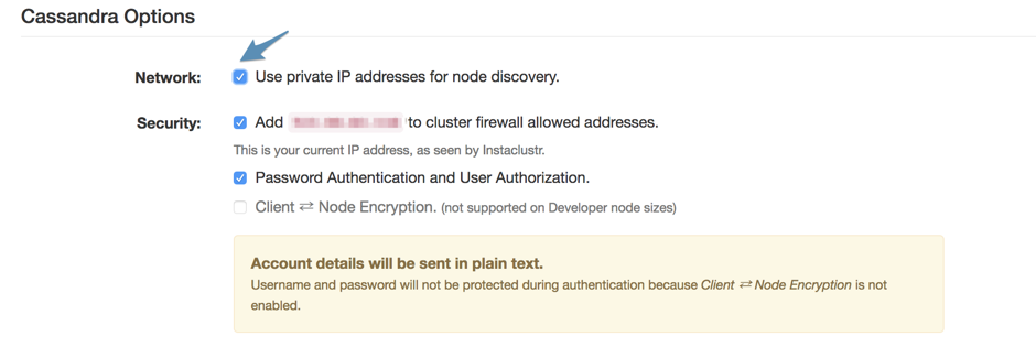 Note: If you only intend to connect to your CDC privately, then choose broadcast private IP address when you create a new CDC. If you intend to connect both privately and from other sources then contact support for an explanation of the options and their implications.