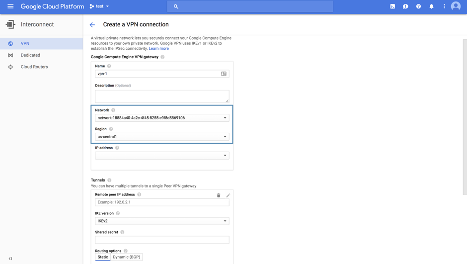 1. Head over to the VPN subtab of the Interconnect tab under the Networking menu from the Google Cloud console and create a VPN connection. Associate the VPN with the network and region of your CDC. Note that for the IP address, you have to assign it a static IP, which will be the IP of your VPN.