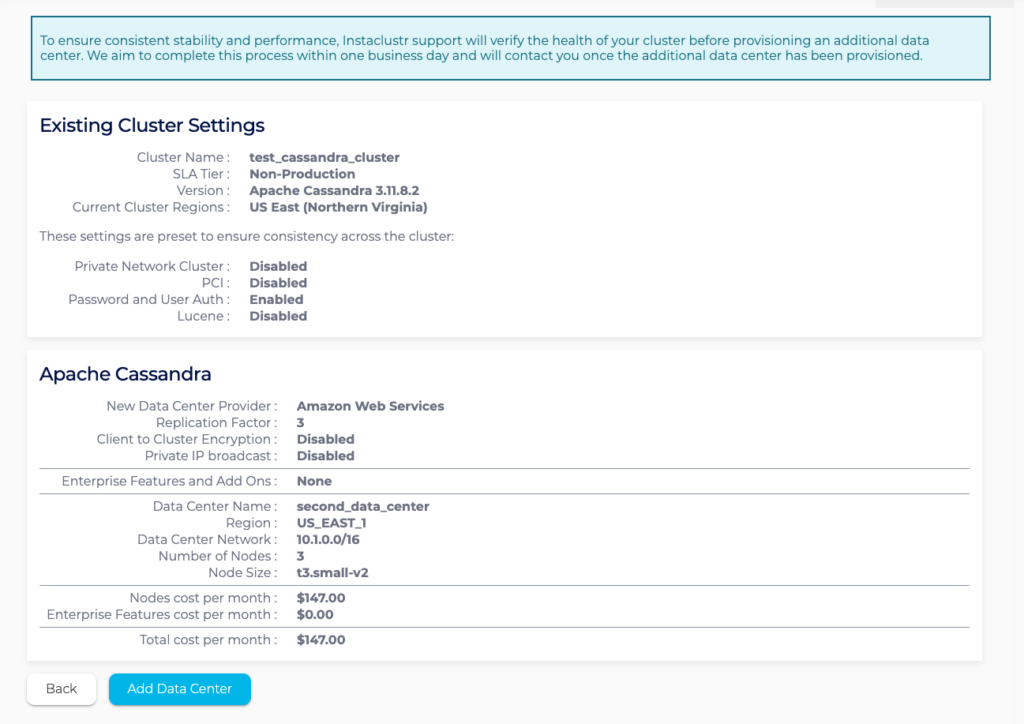 Note: To ensure consistent stability and performance, Instaclustr support will verify the health of your cluster before provisioning an additional data centre. We aim to start this process within one business day and will contact you once the additional data centre has been provisioned.