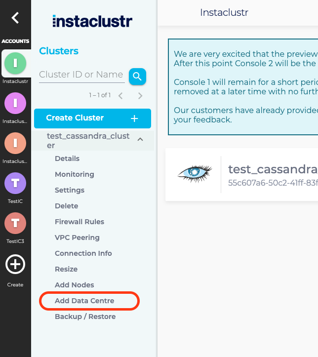 - To add a new Data Center to your existing cluster, log into the Instaclustr console.