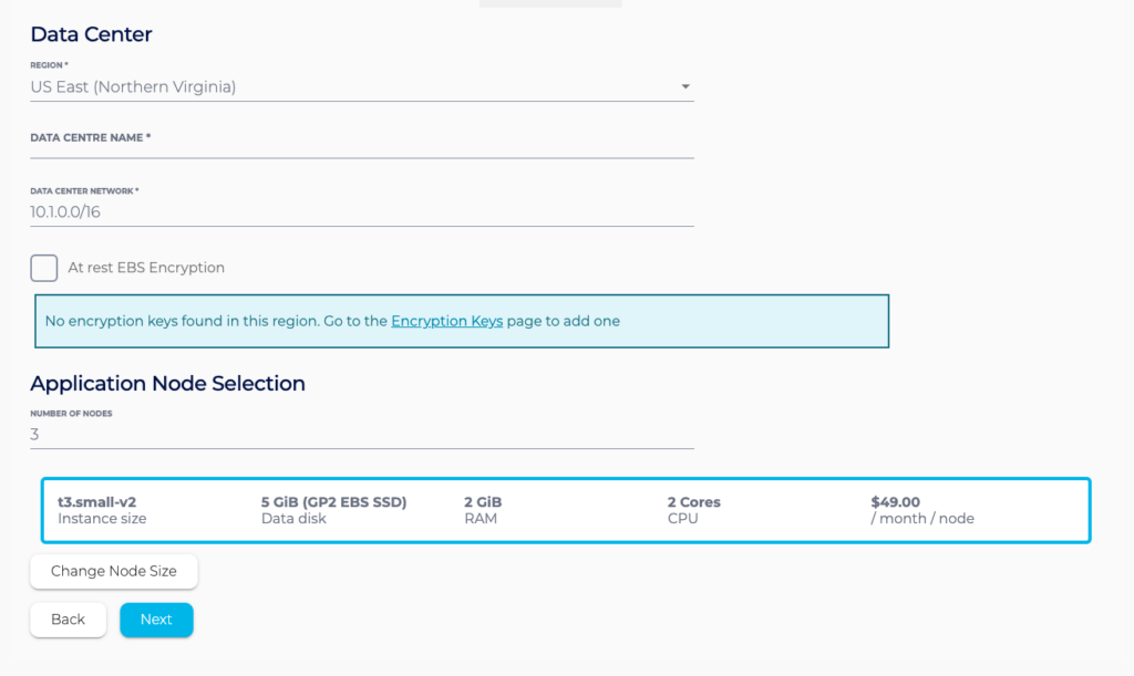 If the data centre for your cluster is running on Amazon’s EBS infrastructure, you can also choose to encrypt your data with an AWS KMS key. Note: Multi-region or multi-provider clusters will incur additional network charges. Please contact [email protected] to confirm. - Finally, the Confirmation section displays a brief summary of your datacenter configurations and pricing details. Once you have verified the details, click the Add Data Center button.