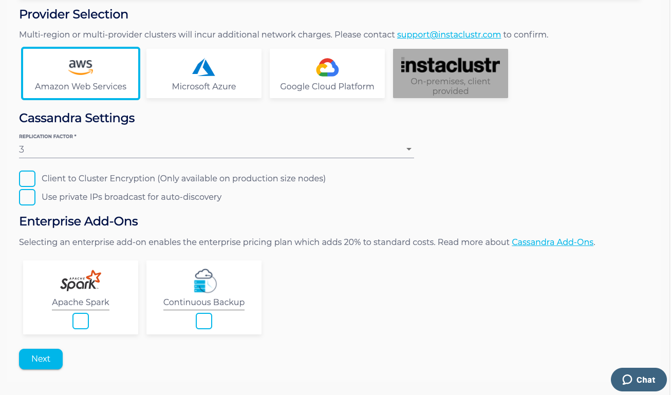 - Under the Settings section of the wizard, specify an infrastructure provider for your new data center. Then choose your desired Cassandra settings and any additional add-ons that you require for the new data center.