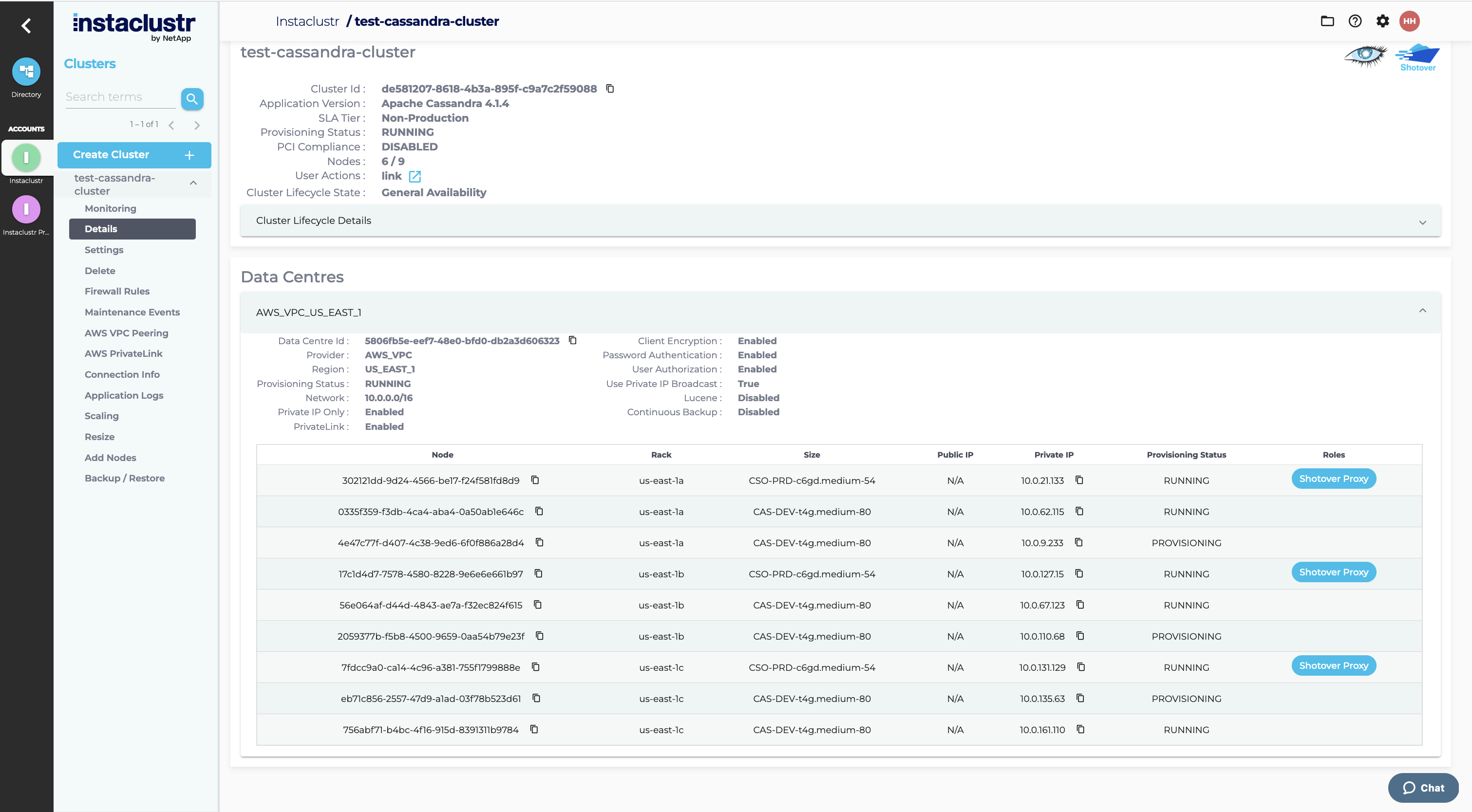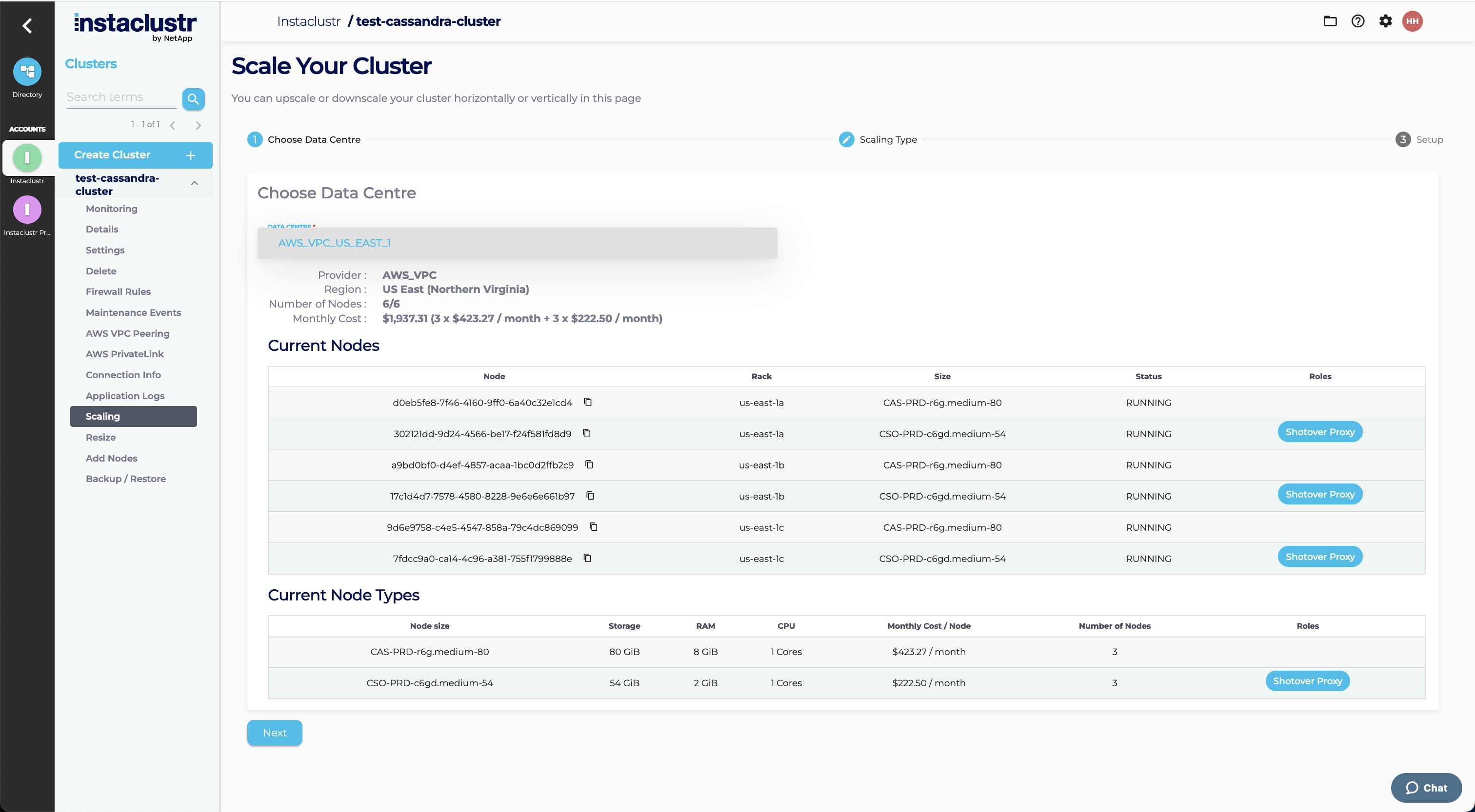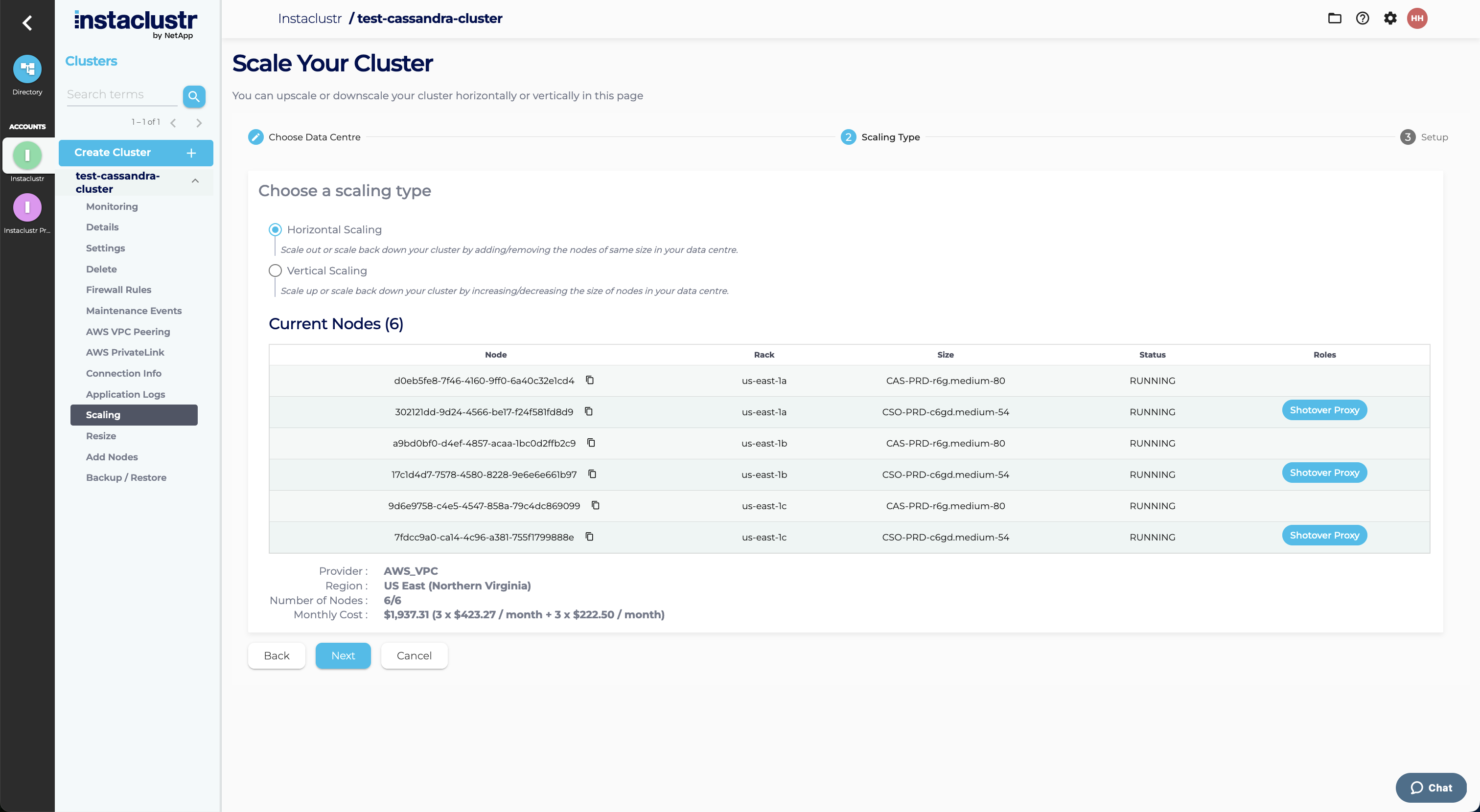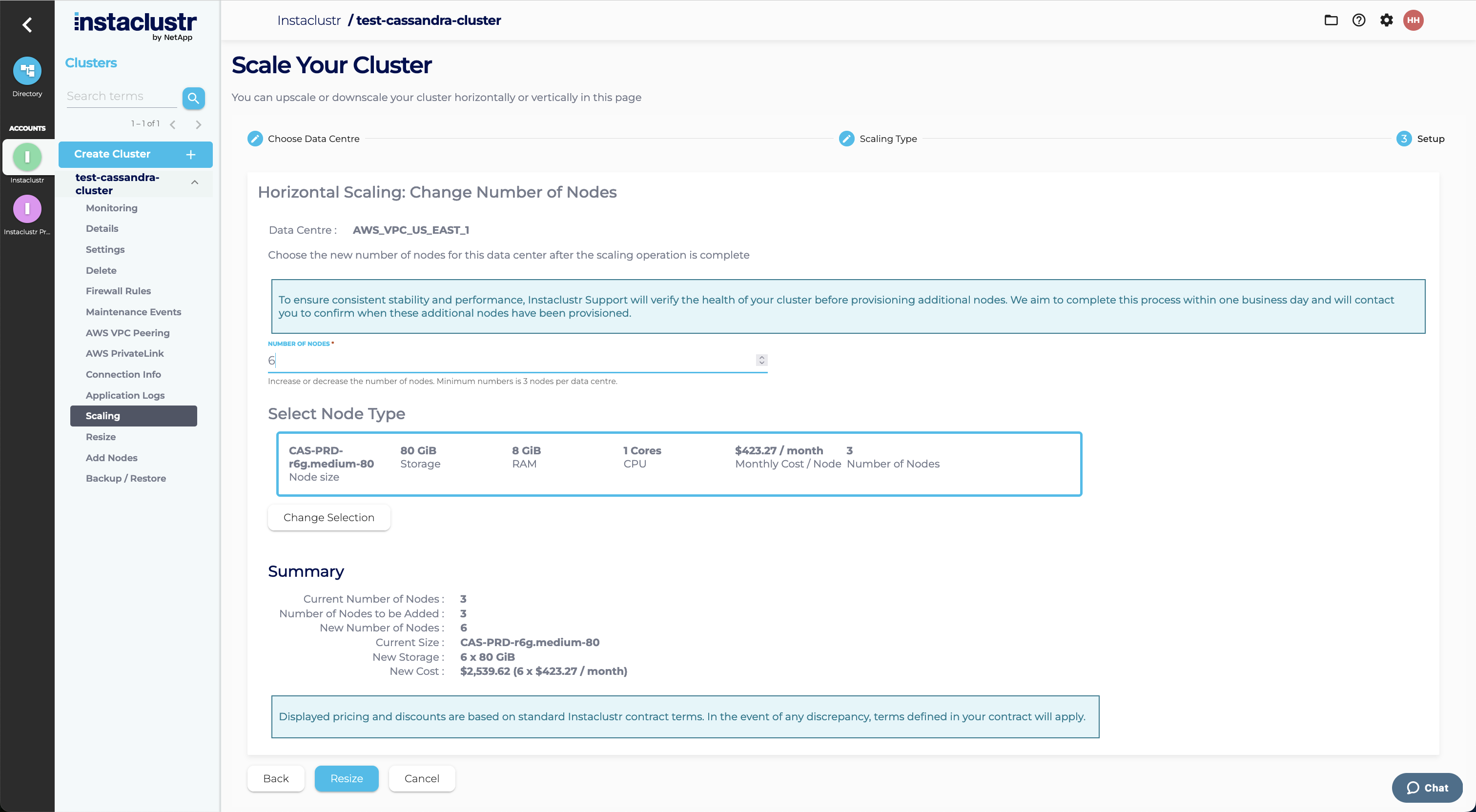 - Select your running Cassandra cluster from the sidebar menu and Click Scaling.