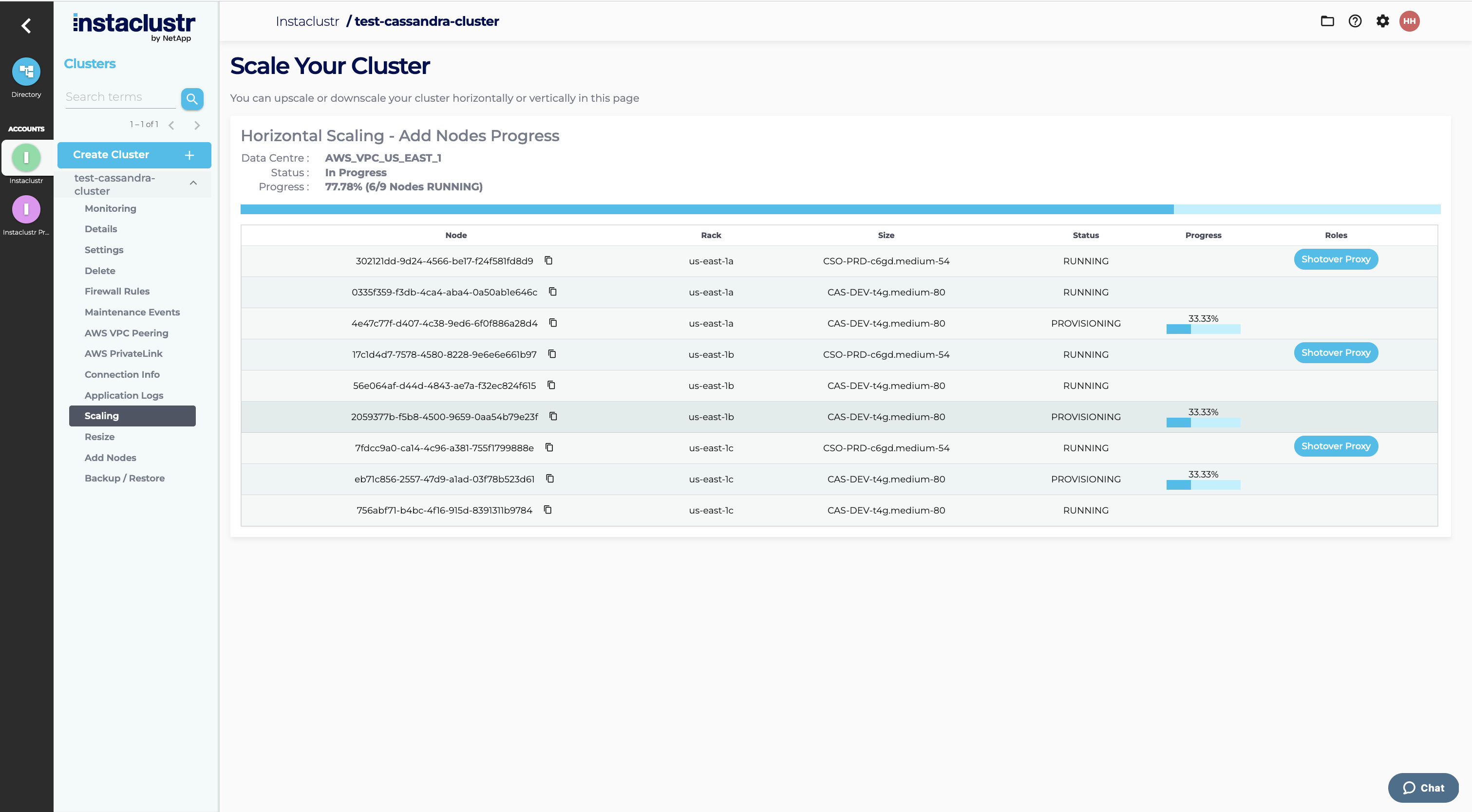 Note: To ensure consistent stability and performance, Instaclustr support will verify the health of your cluster before provisioning additional nodes. We aim to start this process within one business day and will contact you to confirm when these additional nodes have been provisioned. - While a resize is in progress, the scaling page will display the progress of the resize. You will see individual nodes switch statuses as they progress through the scaling process.