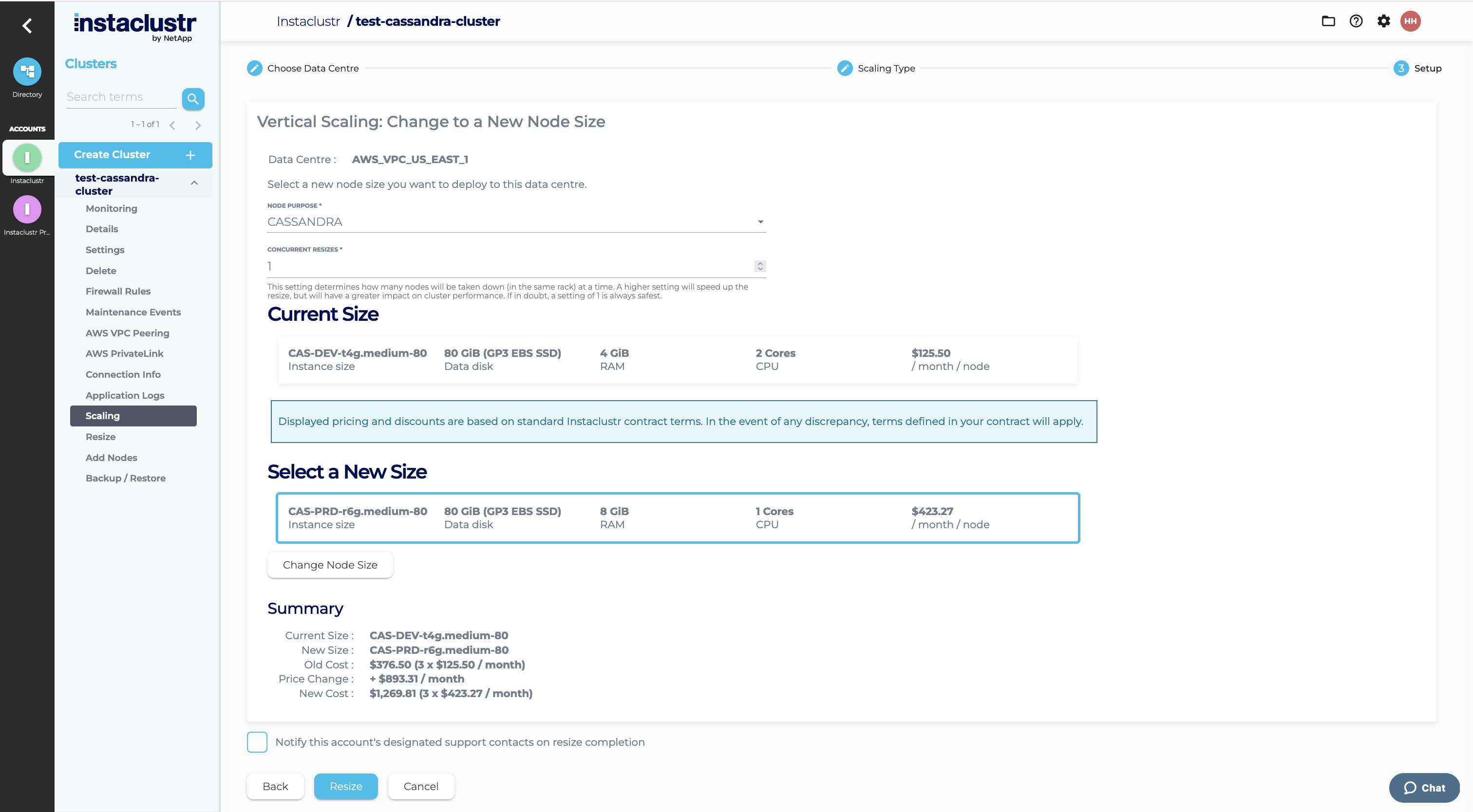 The vertical scaling page lets you select the desired target node purpose, size and specify the resize concurrency factor and notification options. The difference in CPU core count, memory quota and total monthly price are listed on the page.