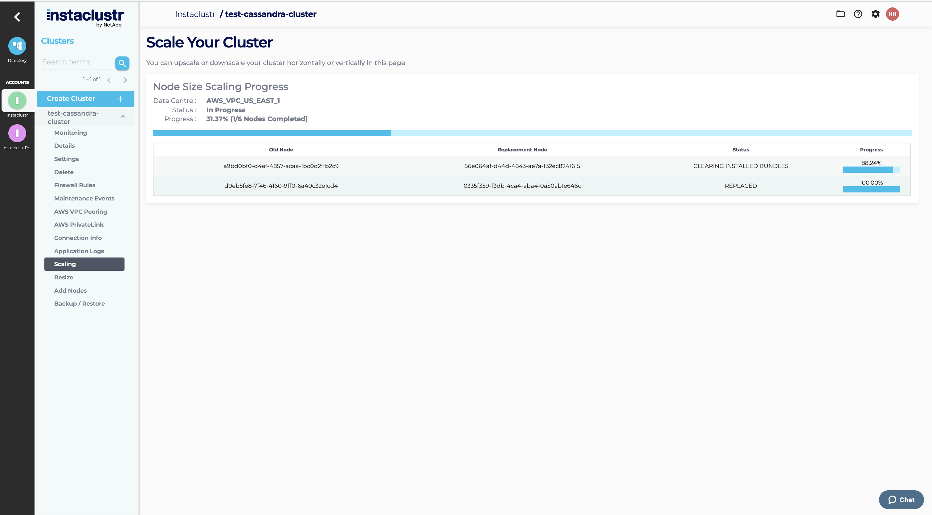 - While a resize is in progress, the Scaling page will display the progress of the resize. You will see individual nodes switch statuses as they progress through the scaling process.