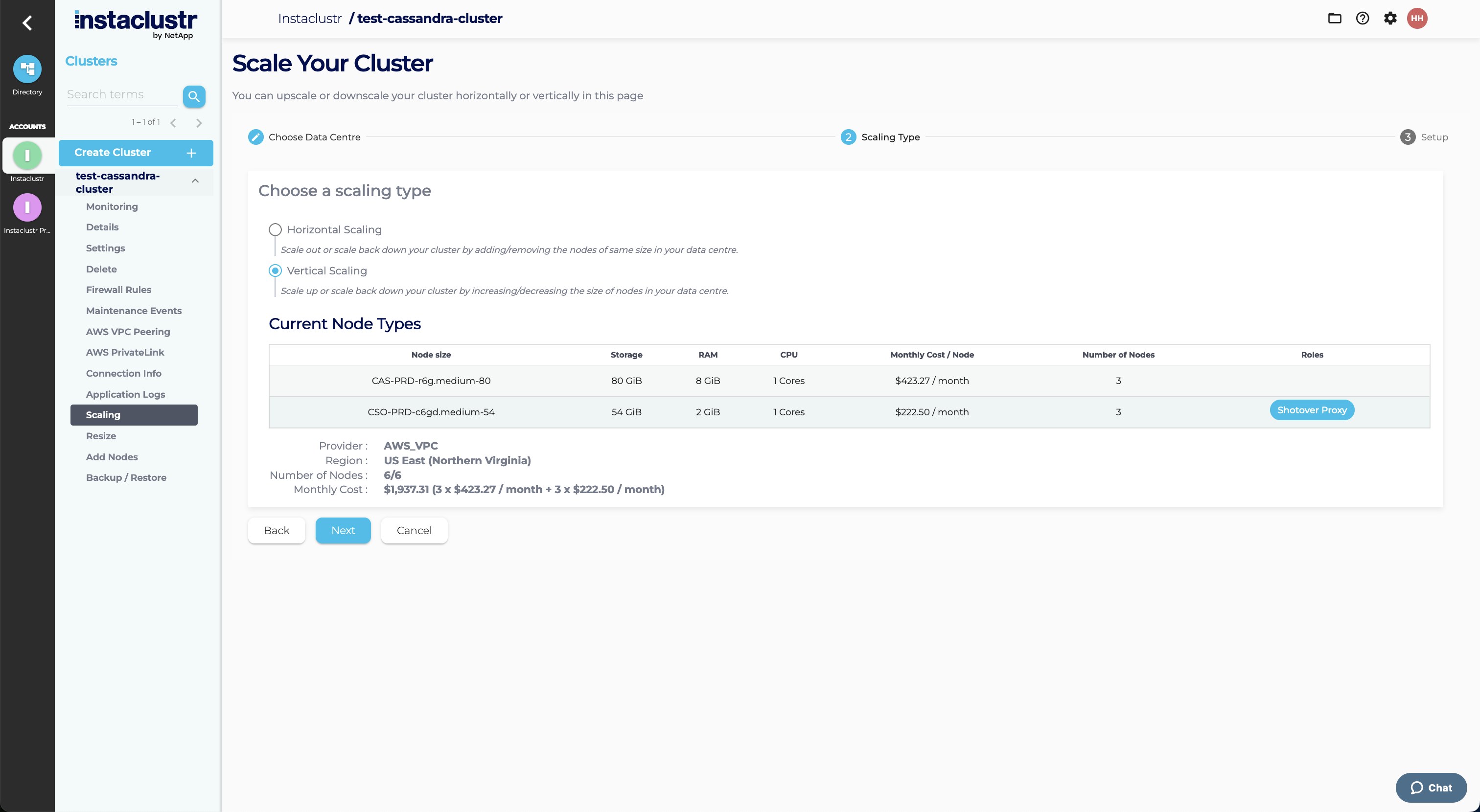 - Select your running Cassandra cluster from the sidebar menu and Click Scaling.