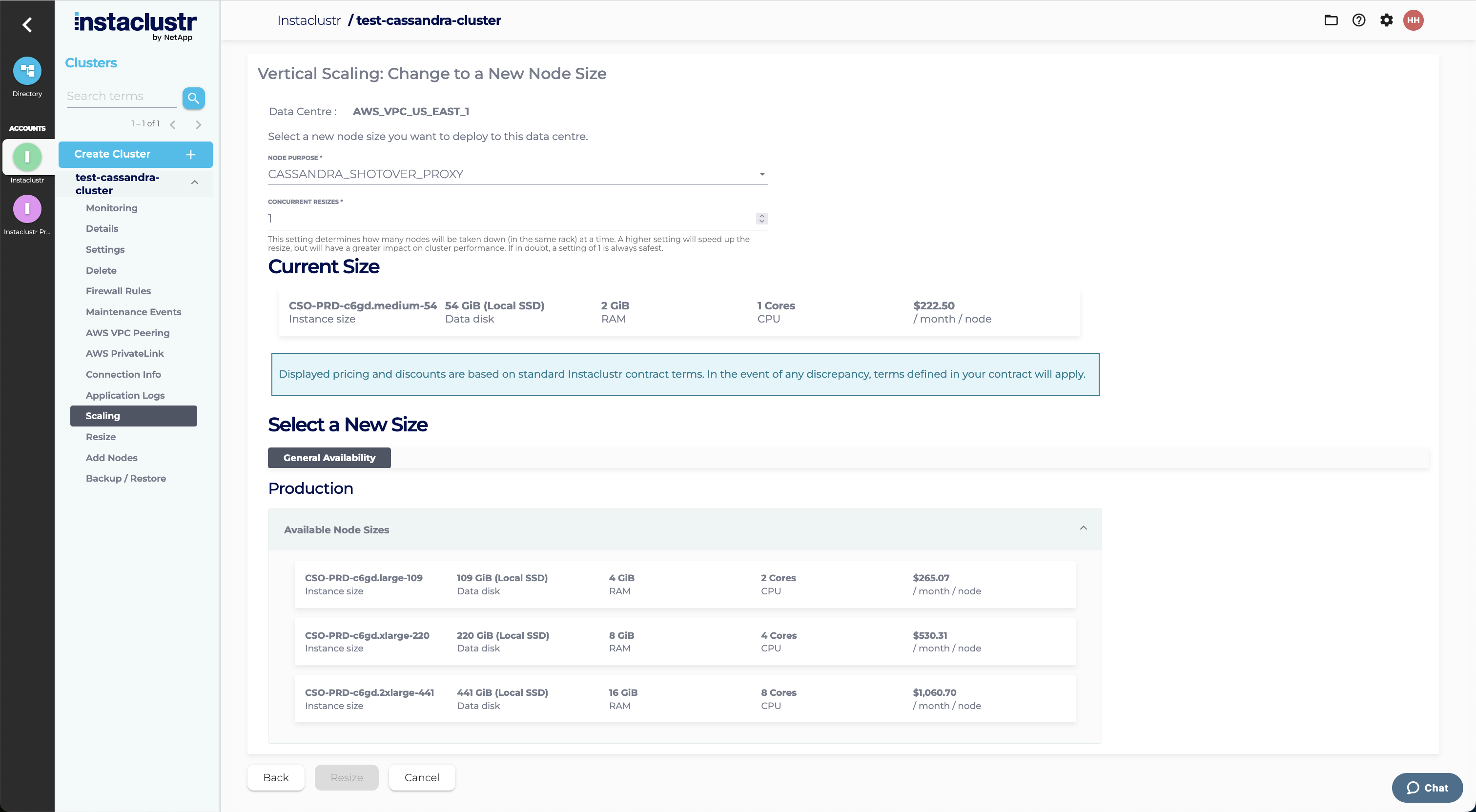 The Concurrency Factor is a number, from 1 to the count of nodes in the largest rack, that specifies how many nodes may be resized at the same time. Instaclustr will only resize multiple nodes concurrently if they are located in the same rack. After you have selected a new size, you will be shown a summary of the resize, which will include the new price for managing your cluster. Click on Resize to begin.