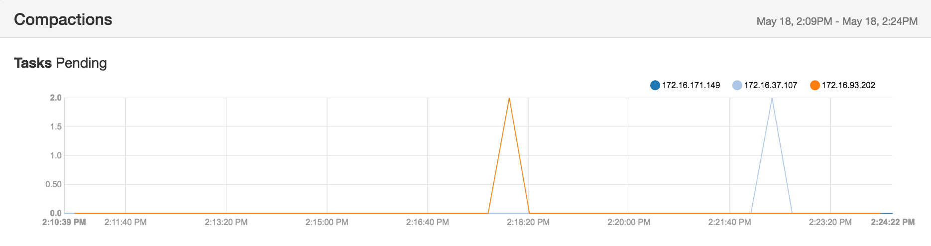 Cassandra performs compactions to remove duplicate entries and merge SSTables to keep read throughput high and disk usage low. Compactions are an ongoing background task executed by Cassandra. Pending compactions is the number of compaction tasks that are waiting for a thread to become available.