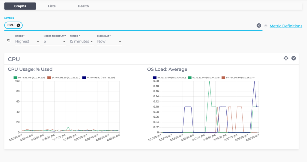 You can view the Average OS Load for your nodes by accessing the CPU option under the group Node – OS. This page will display both the CPU Usage and Average OS Load for your nodes. The graph displays the average amount of work the computer system performs on each node.