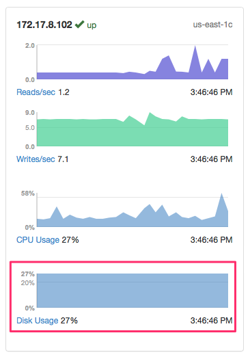 The disk usage metric shows the percentage of space used on the data partition of a node. This includes the main Cassandra files containing your data as well as working files such as snapshots for backups and temporary copies of files used for compactions.