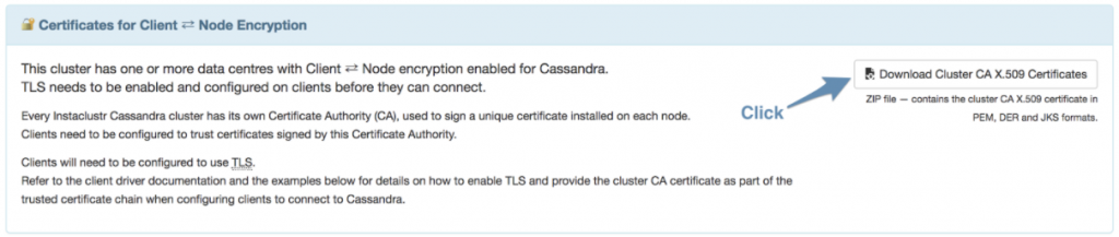 As a prerequisite to this guide, the user should have provisioned and configured a cluster with both Cassandra and Spark. You can find the details on how to do this in sections 1, 2 and 3 of the following article. Getting Started with Instaclustr Spark & Cassandra. Remember to select Client ⇄ Node Encryption to enable client encryption when creating the cluster. This option is not available for Developer node size, so you must select a Production node size.