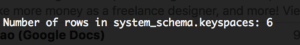 1234567891011121314151617181920212223import org.apache.spark.SparkContextimport org.apache.spark.SparkConfimport com.datastax.spark.connector._object cassandraCount {def main(args: Array[String]) {// 1. Create a conf for the Spark context// In this example, Spark master and Cassandra nodes info are provided in a separate count.conf file.val conf = new SparkConf().setAppName("Counting rows of a cassandra table")// 2. Create a Spark context.val sc = new SparkContext(conf)// 3. Create an rdd that connects to the Cassandra table "schema_keyspaces" of the keyspace "system_schema".val rdd = sc.cassandraTable("system_schema", "keyspaces")// 4. Count the number of rows.val num_row = rdd.count()println("nn Number of rows in system_schema.keyspaces: " + num_row + "nn")// 5. Stop the Sspark context.sc.stop}}