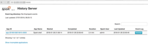 With the History Server running, browse to https://<Spark client IP>:18080/ and you should see the Spark History Server page displayed: