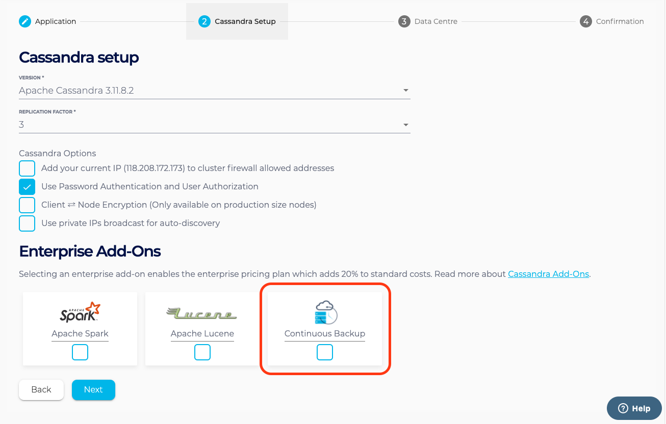 If you would like to enable Continuous Backup on an existing cluster, please contact Instaclustr Support.