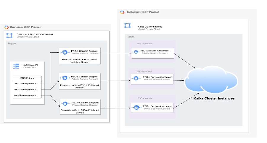 This guide describes how to provision a Private Service Connect Kafka Cluster on the Instaclustr Platform. Private Service Connect is a feature provided by Google Cloud Provider that enables private connectivity between Google Cloud services and applications in your Virtual Private Cloud (VPC). By using PSC, you can establish a private data flow between Google Cloud services and your own VPC without exposing your data to the public internet, thereby increasing security. More information from GCP about PSC is available here.