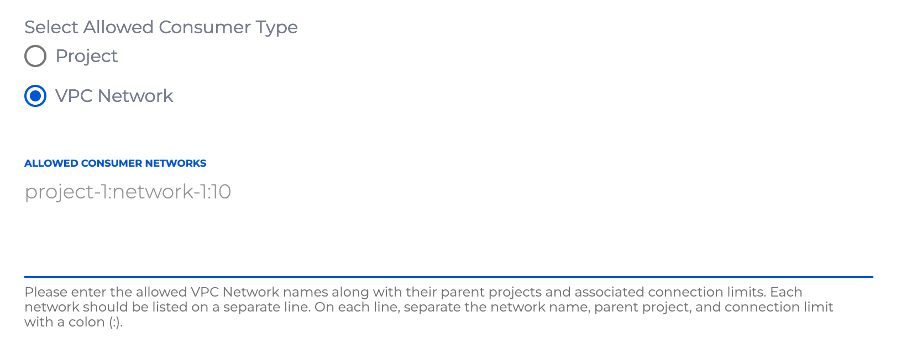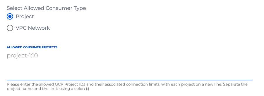 Consumer accept list let you specify projects or VPC networks but not both at the same time. Both project-based and network-based accept lists take in the project ID as a main reference. The network-based accept list additionally accepts the network name of the project. At the end of the string, specify the connection limit which is the number of consumer endpoints or backends that can connect to this service and separate them all with colon (:). For example, if you would like to allow 100 connections from project ID instaclustr then put instaclustr:100 into the text box. To narrow the scope to network, update the item to instaclustr:<network-name>:100.