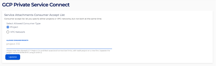 The list can also be updated later via Console GCP Private Service Connect update page. We enable connection reconciliation by default, hence adding or removing items from the list will affect the existing connections. For instance, when you remove a project from the accept list, all connections of that project are transitioned to pending.