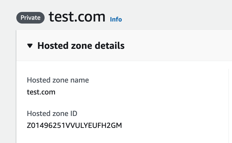 - If there is an existing hosted zone, please find the hosted zone ID under Hosted zone details for the parameter, “HostedZoneExistingID”. For instance, if there is already an existing hosted zone “test.com”, the value of “HostedZoneExistingID” will be Z01496251VVULYEUFH2GM. By specifying the value, the AWS CloudFormation template would not attempt to re-create another hosted zone with the same name.