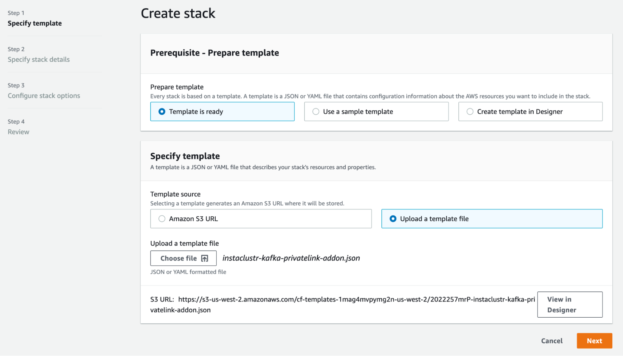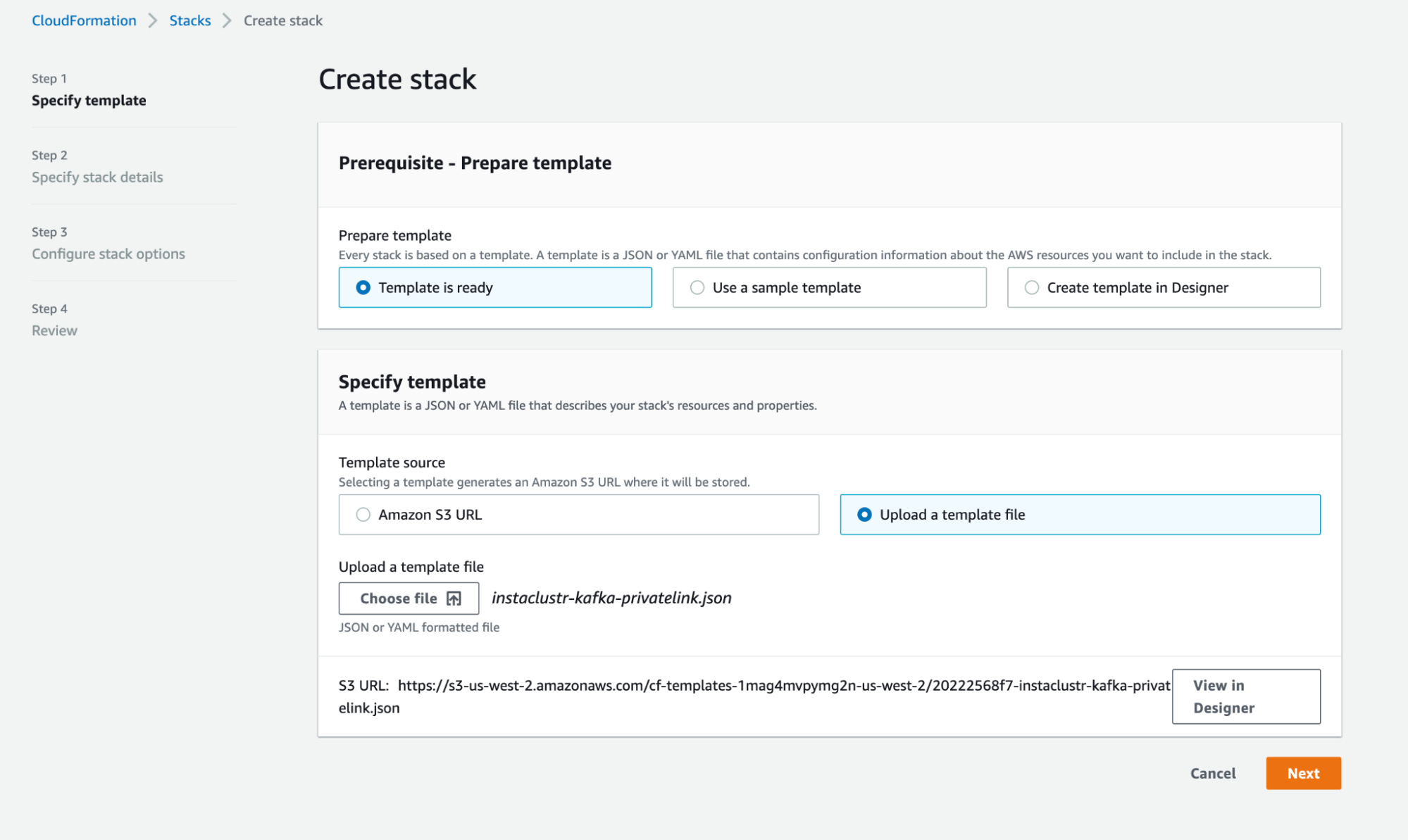 - Select “Create Stack” and upload the saved template, instaclustr-kafka-privatelink.json. Select “Next”.