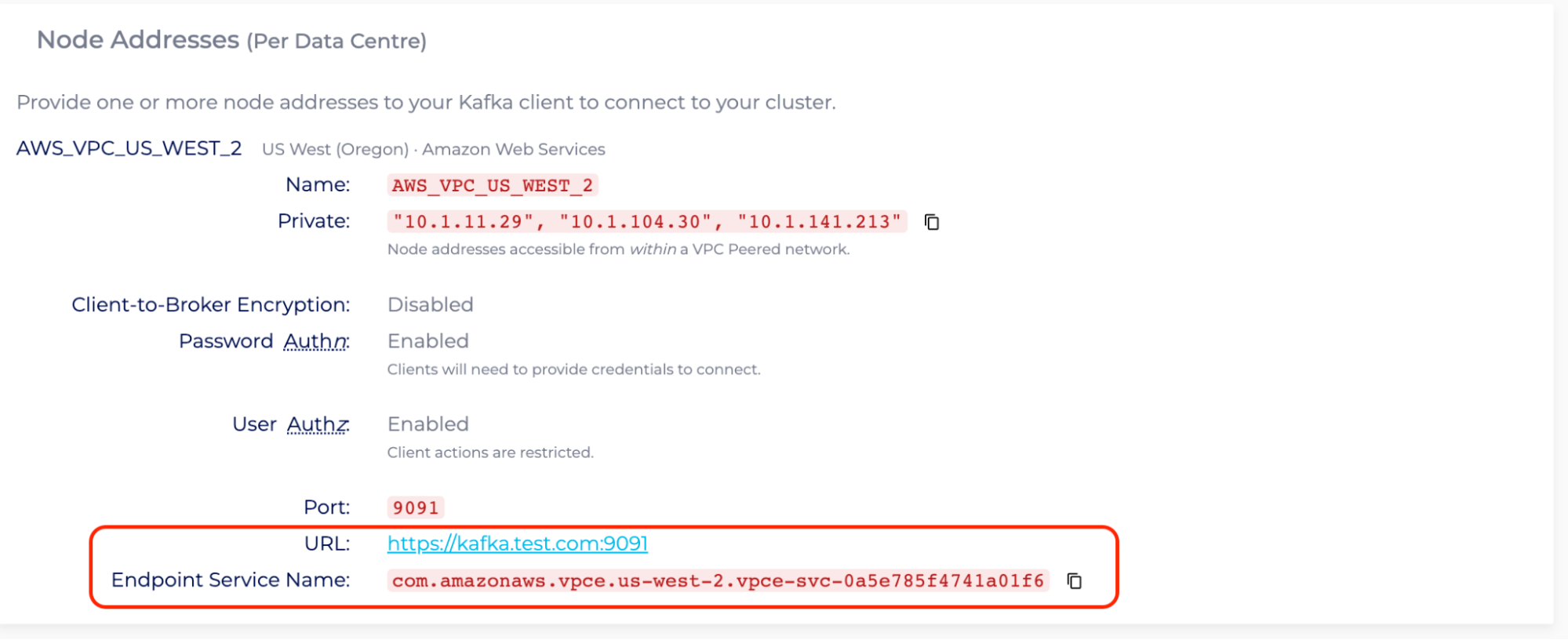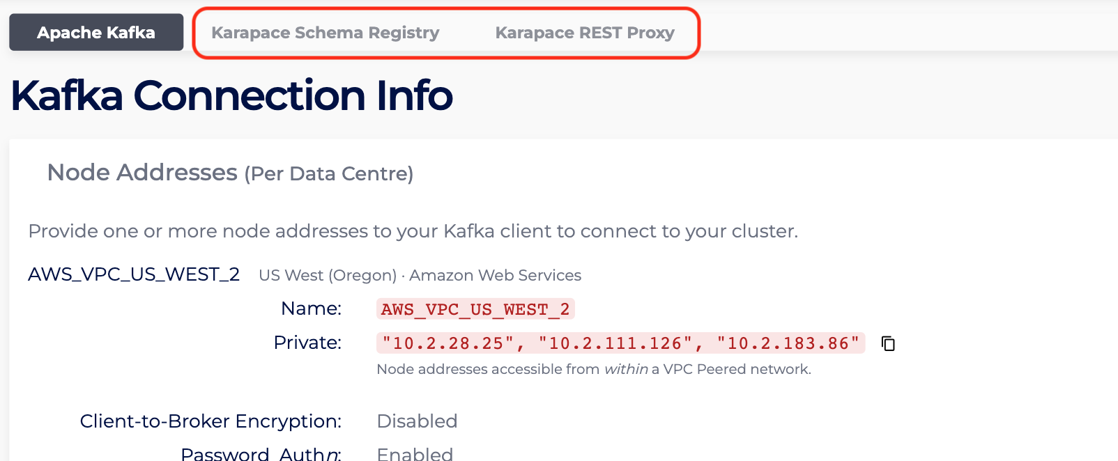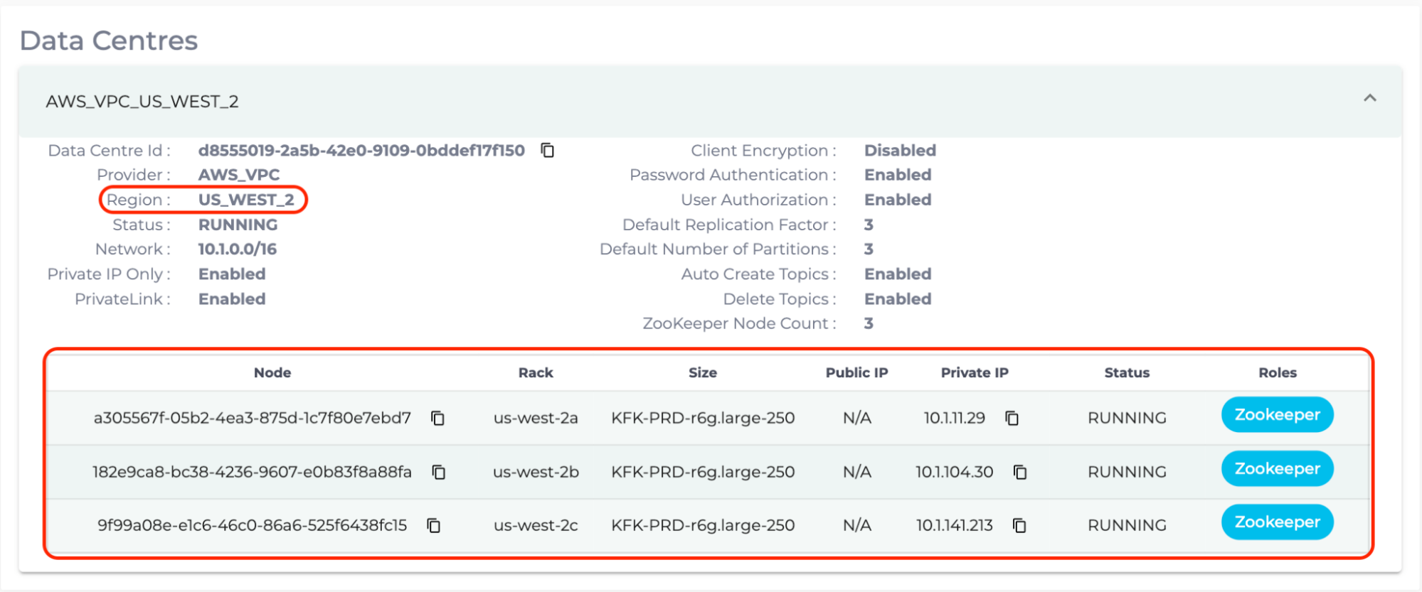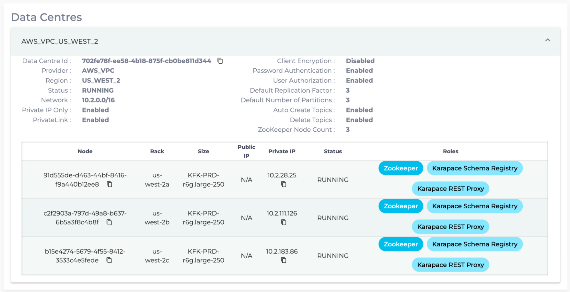 - As for “RestProxyNodes”, enter the Details page of the PrivateLink Kafka cluster with Kafka Add-Ons, and count the number of nodes with the tag “Karapace REST Proxy”. In the following case, “RestProxyNodes” is 3.