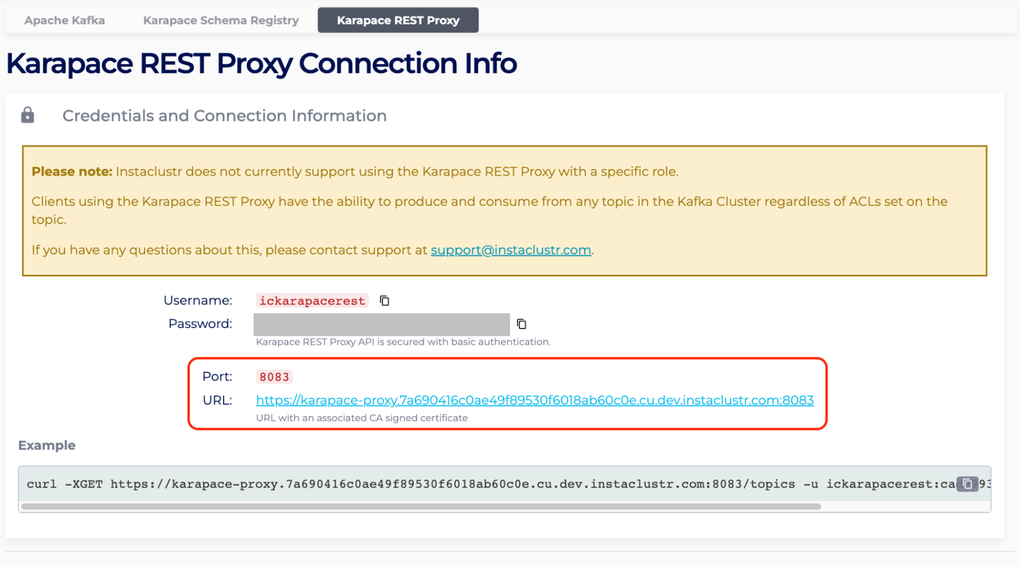For example, under Karapace Rest Proxy, the URL is https://karapace-proxy.7a690416c0ae49f89530f6018ab60c0e.cu.dev.instaclustr.com:8083. The “InstaclustrDomain” is 7a690416c0ae49f89530f6018ab60c0e.cu.dev.instaclustr.com.