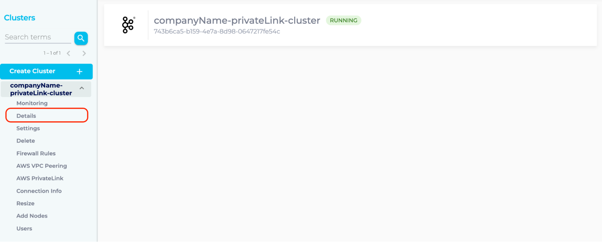 - Log into Instaclustr Console, click the PrivateLink Kafka Cluster created and enter the Details page.