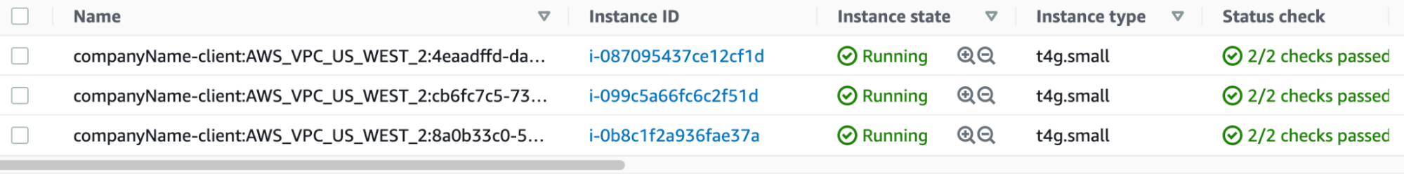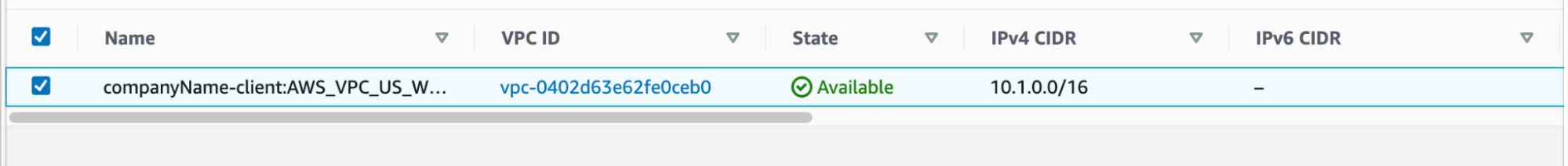 - Find the client EC2 instances that will connect to the PrivateLink Kafka Cluster. For instance, companyName-client. Find the “ClientVPC” and the “ClientCIDRIp” in the VPC console.https://us-west-2.console.aws.amazon.com/vpc/home?region=us-west-2#vpcs:tag:Instaclustr:ClusterName=companyName-client.In this case, “ClientVPC” is vpc-0402d63e62fe0ceb0 and “ClientCIDRIp” is 10.1.0.0/16.
