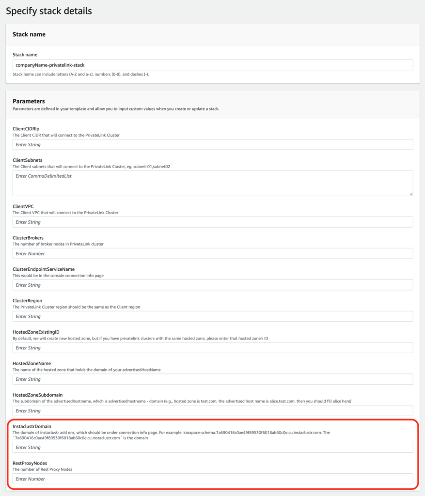 - The form would be similar to the one in step 4 in Section 1. The difference is the additional two parameters: “InstaclustrDomain” and “RestProxyNodes”.