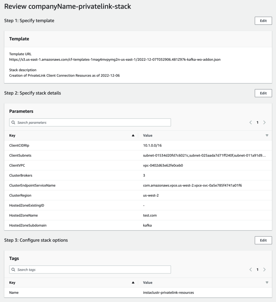 The process is the same as the steps listed in Section 1: Using the AWS CloudFormation template for PrivateLink Kafka Cluster without Kafka AddOns. For the purpose of this section, we will refer Section 1: Using the AWS CloudFormation template for PrivateLink Kafka Cluster without Kafka AddOns as Section 1.