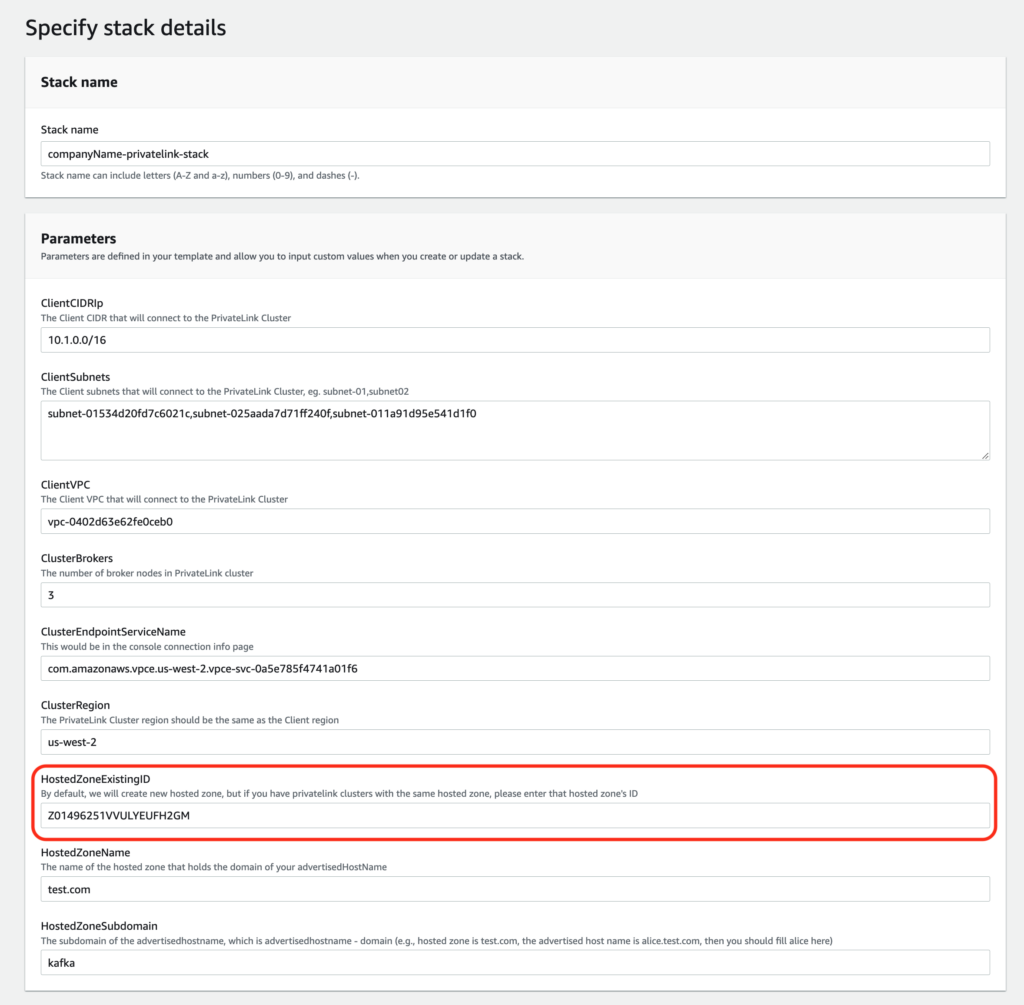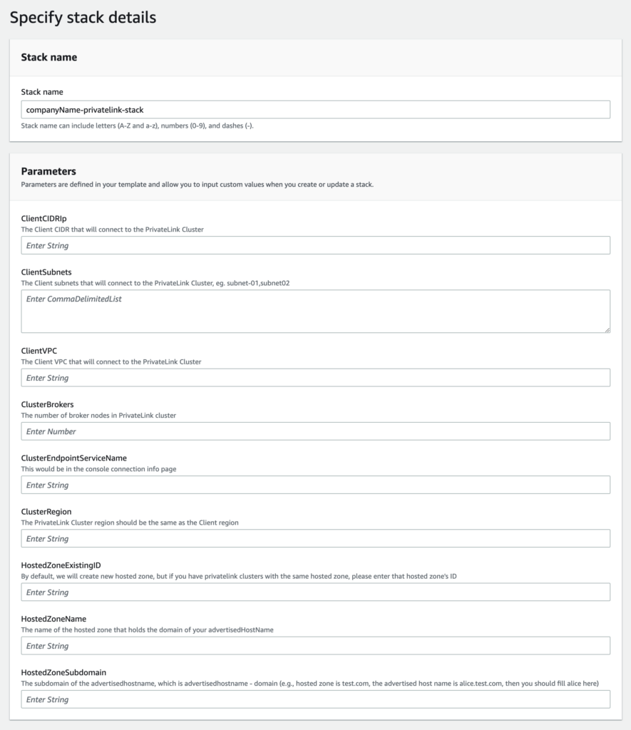 Please ensure the region is the same as the created PrivateLink Kafka Cluster.If there are multiple client instances, please be sure to have all the subnets comma separated. For instance, enter subnet-01534d20fd7c6021c,subnet-025aada7d71ff240f,subnet-011a91d95e541d1f0 as “ClientSubnets”